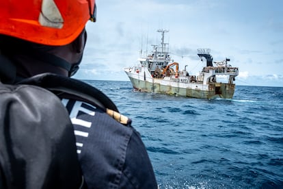 « Les navires illégaux pêchent généralement avec des réseaux à maille fins, qui capturent tout ce qui rien dans la mer ou rampe par le fond », explique le commandant lorsque le bateau revient et tandis qu'Izan à bord. « Y compris les petits poissons immatures. »