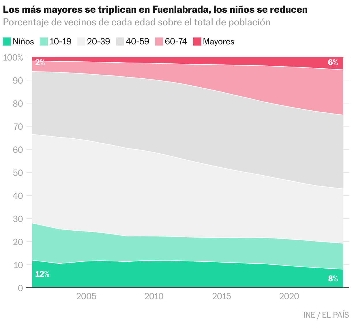 À l'heure actuelle, dans ces villes de la banlieue de Madrid, ces plus de 75 dépassent les enfants entre 0 et 9 ans. Fuenlabrada est, aujourd'hui, la seule exception, quelque chose qui semble passager parce que les personnes de plus de 75 ont triplé au cours des 15 dernières années, tandis que les enfants sont passés de 12% à 8%. Et ce n'est que le début.